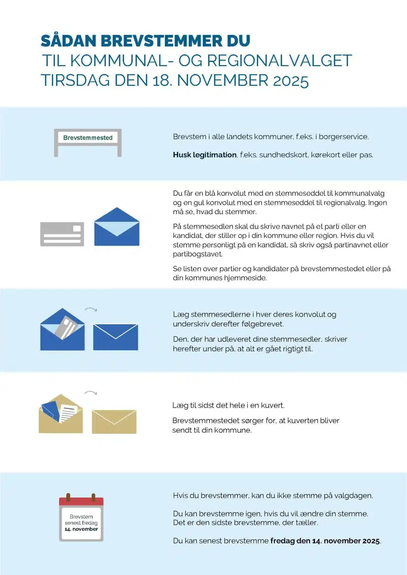 Du kan få flere oplysninger om at brevstemme hos kommunen.